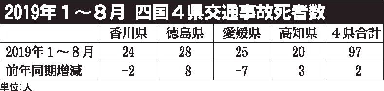 2019年1~8月の四国4県の交通事故件数は前年同期比12・8%減の7585件となり、負傷者数も同13・5%減の8936人と、事故件数、負傷者数とも減少した。半面、同期間の死者数は97人と件数の減少にかかわらず、増加に転じている。9月に入...