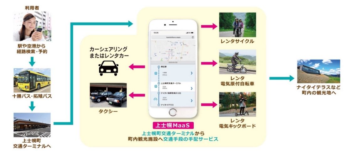 利用者はMaaSアプリを活用することで、周辺の観光地や飲食施設へ簡易・便利に移動できる。ユーザーの移動行動に応じたポイント付与など、移動需要の創出や移動最適化のための機能も順次追加する予定。2019年11月以降、実施して、MaaSアプリの受容性やニーズ、新しい移動手段に対するニーズや技術を検証する。
