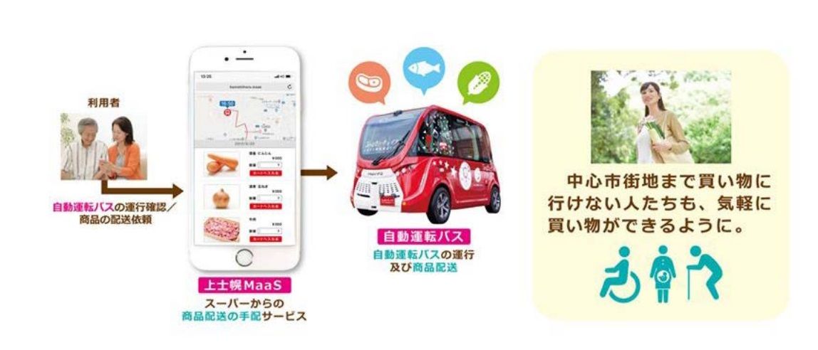 実証実験は町内のスーパーから高齢者が多く居住する団地内まで、自動運転車両を走行、上士幌町の住民が専用スマホアプリで注文・配送予約した商品と、上士幌町の住民を同時に運ぶ貨客混載を実施する。10月5~7日までの3日間で、自動運転での貨客混載の受容性、自動運転技術について検証する。