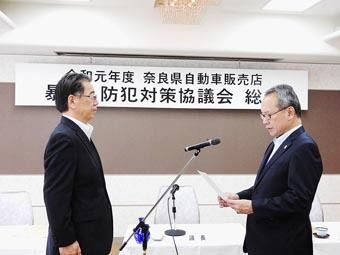 【奈良】奈良県自動車販売店暴力・防犯対策協議会(菊池攻会長)は10日、奈良市内のホテルで「令和元年度総会」を開いた。菊池会長が、「暴力団追放3ない運動ぷらす1」の実践などを盛り込んだ決議文を県警察本部の宮本勝弘刑事部長に手渡し、あらゆる暴...