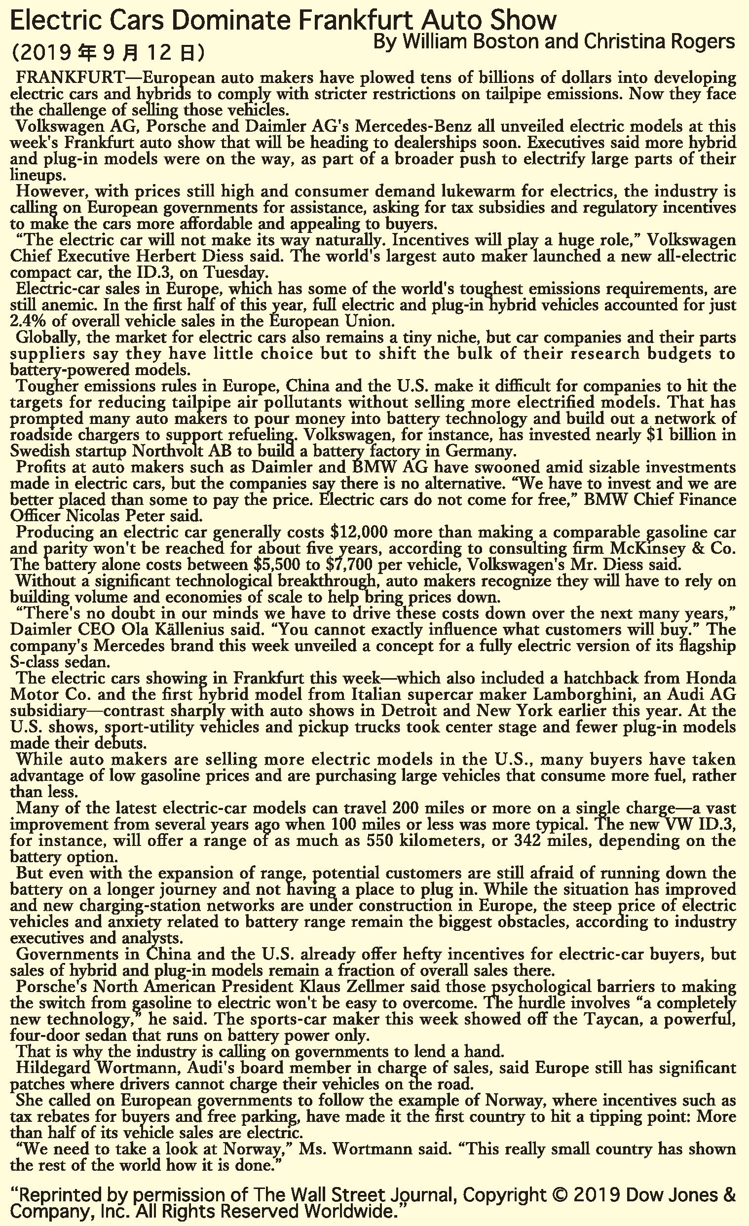 By William Boston and Christina Rogers 2019 年 9 月 12 日 【フランクフルト】今年のフランクフルト国際自動車ショーは、電気自動車(EV)一色に染まっている。だが、メーカーはいかにして販売を...