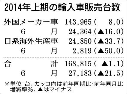 日本自動車輸入組合(JAIA)が4日発表した2014年上期(1~6月)の外国メーカーの輸入車新規登録台数は前年比8・0%増の14万3965台となり5年連続で増加した。過去最高だった1997年上期に次ぐ2番目の高水準で、1~3月の駆け込み需...