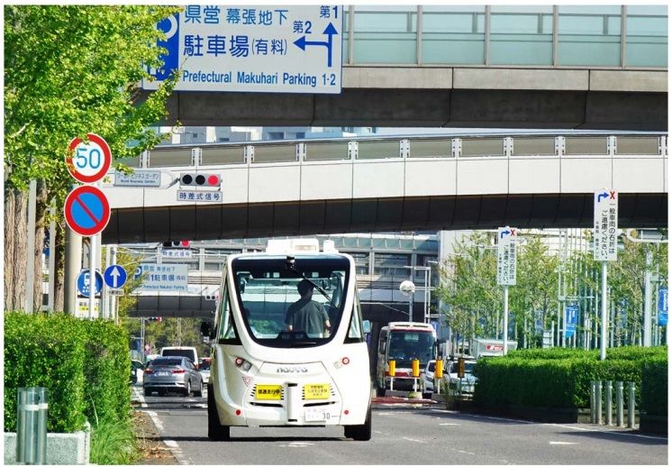 実証実験でSBドライブはステアリングのない自律走行バス「ナビヤ アルマ」を使って「CEATEC 2019」の会場である幕張メッセの「国際展示場」9~11ホール前のロータリーから左回りに1周する。専用空間ではなく、公道を走行する。