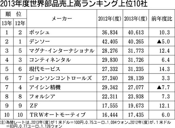 自動車産業の専門調査会社、フォーイン(名古屋市千種区、鈴木雅夫社長)は、2013年度の部品メーカーの売上高ランキングをまとめて発表した。13年度の為替レートをベースにドル換算して世界の自動車部品企業を比較したもので、独ボッシュが2年ぶりに...
