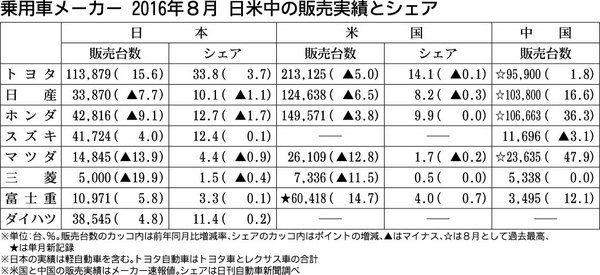 乗用車メーカー8社の8月の主要国での販売台数は、中国で4社が過去最高を記録した。一方、市場が前年を割り込んだ米国では富士重工業を除く5社がマイナスだった。富士重は米国での販売が全ての月を通じ、初めて6万台を超えた。 中国汽車工業協会(CA...