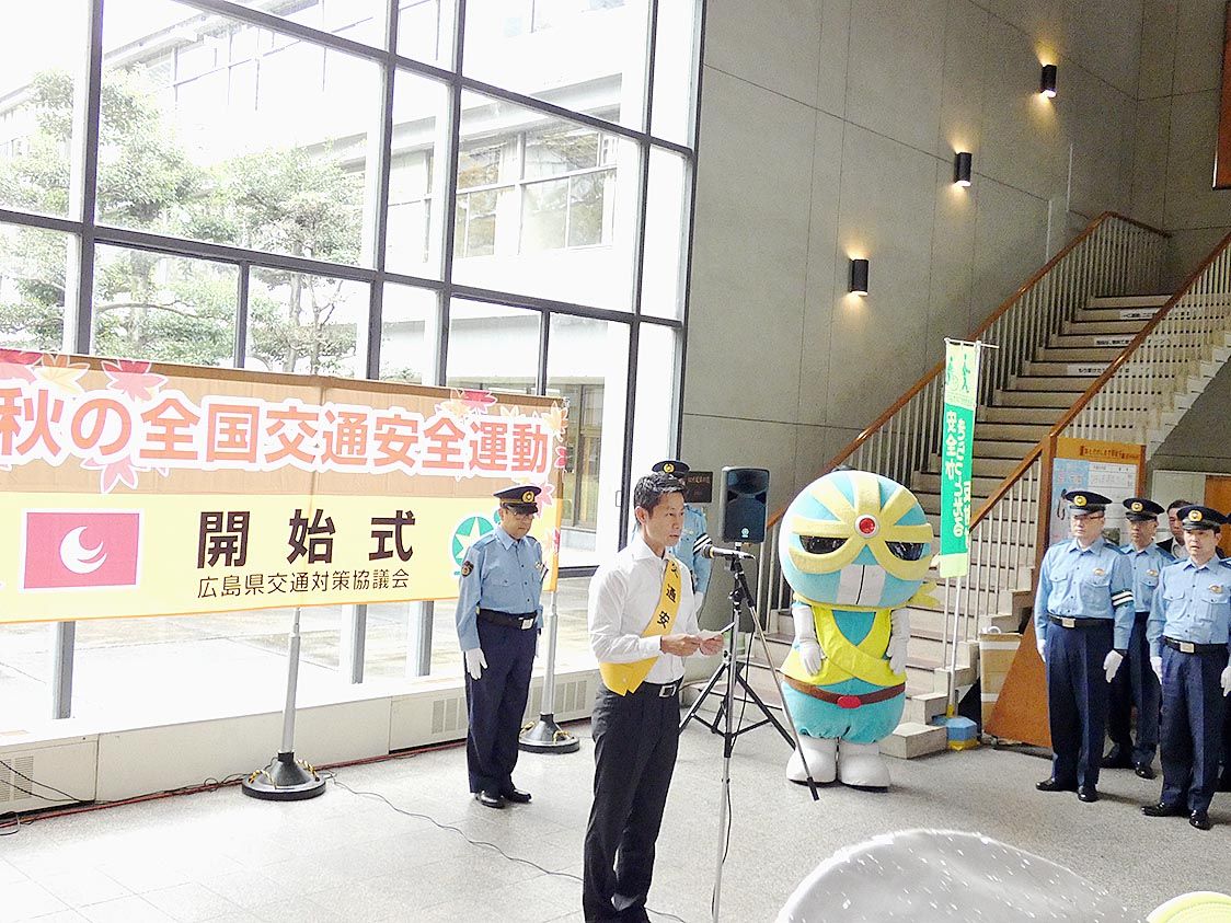 秋の全国交通安全運動を前に、広島県などで組織する広島県交通対策協議会(湯崎英彦会長=広島県知事)が20日、広島県庁で「秋の全国交通安全運動開始式」を開催した=写真。白バイやパトカー、日本自動車連盟(JAF)の救援車両13台によるパレードを...