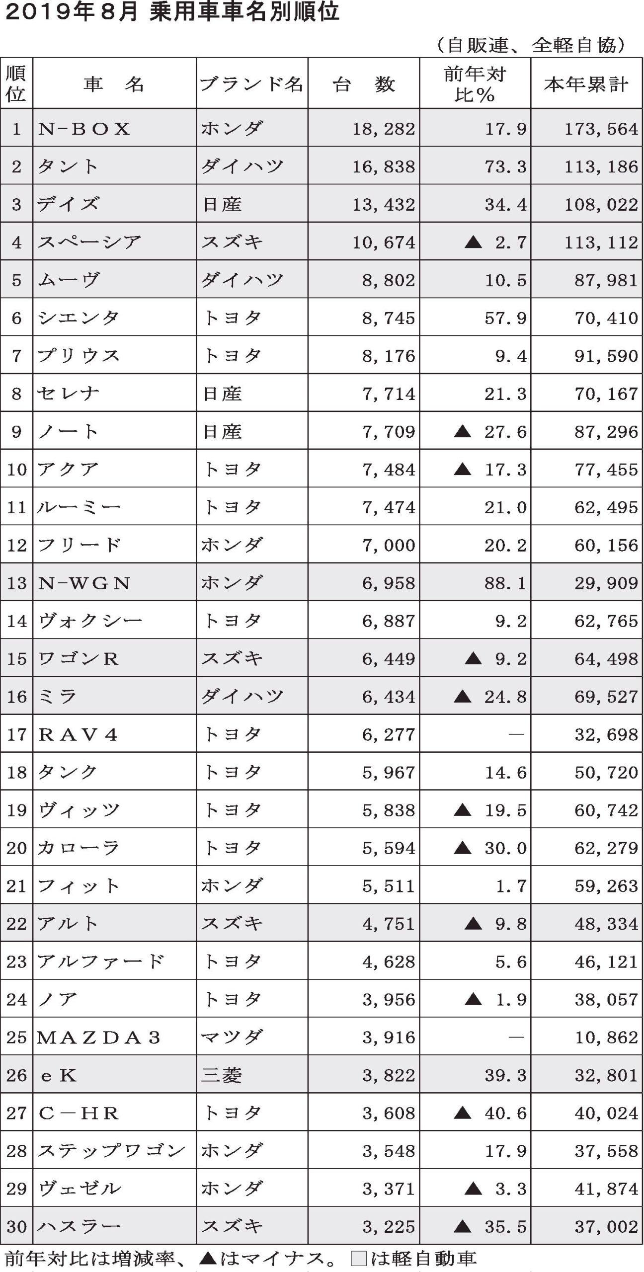 2019年8月 乗用車車名別順位