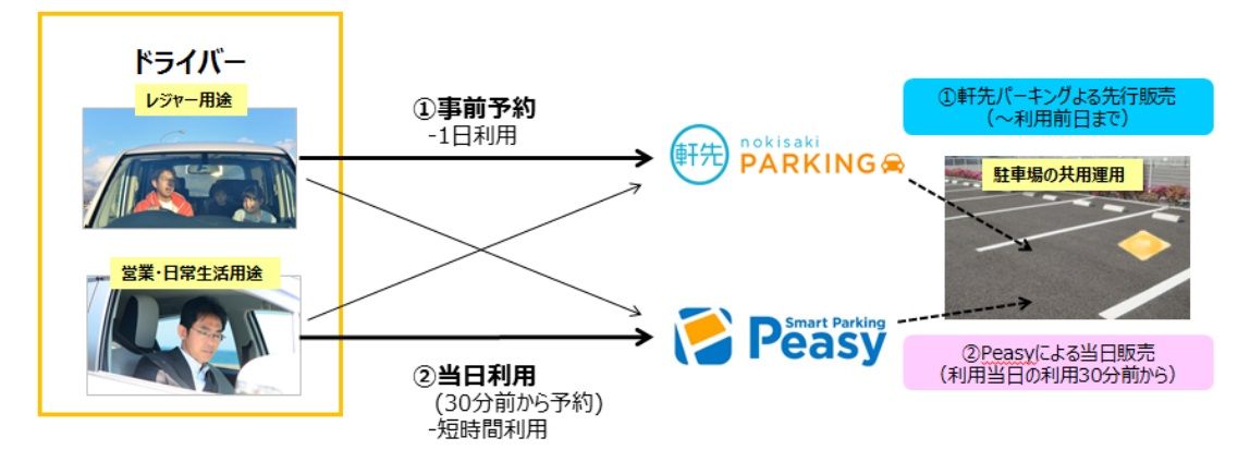1日利用型の軒先のサービスと、時間貸しが可能なドコモのサービスを連携することで、予約が入っていない「軒先パーキング」の駐車場を「スマートパーキングページー」で予約できるようにし、「空車」となっている駐車場の需給のマッチングを図る。