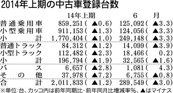 日本自動車販売協会連合会が10日発表した2014年上期(1~6月)の中古車登録台数は、前年同期比1・2%減の201万1833台となり2年連続で減少した。また1978年の統計開始以来上期としては下から2番目の低水準。4月の消費税率引き上げを...
