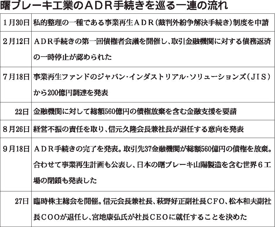 曙ブレーキ工業が27日に臨時株主総会を開催し、約30年間トップだった信元久隆会長兼社長が退任することが正式に決まった。北米事業の不振で経営が傾き、今年1月末に私的整理の一種である事業再生ADR(裁判外紛争解決手続き)制度を申請。事業再生フ...