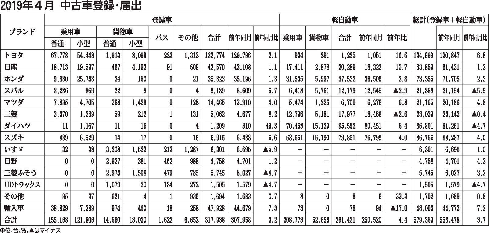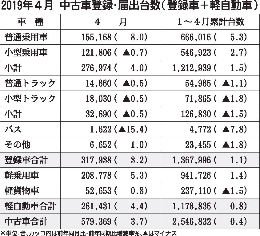 2019年4月の中古車登録・届け出台数、2カ月ぶりプラス