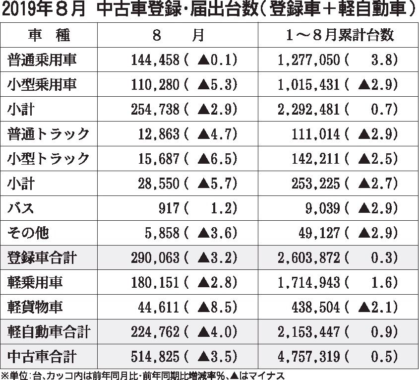 日刊自動車新聞社がまとめた8月の中古車登録・届け出台数は、前年同月比3・5%減の51万4825台となり、2カ月ぶりのマイナスに転じた。登録稼働日が前年同月と比べて2日少なかったことが影響し、登録、届け出ともに減少した。ブランド別でも軒並み...