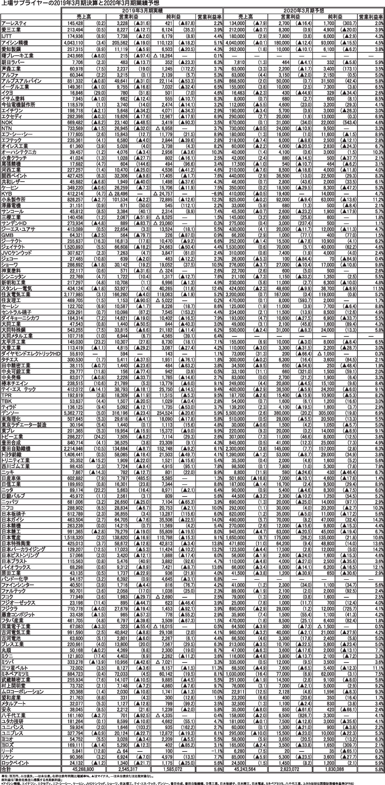 日刊自動車新聞社は上場部品メーカー125社の2019年3月期決算をまとめた。全体の売上高は前期比2%増の45兆2688億円、本業のもうけを示す営業利益は同16%減の2兆5453億円だった。自動車メーカーが品質問題や自然災害などで国内外の生...