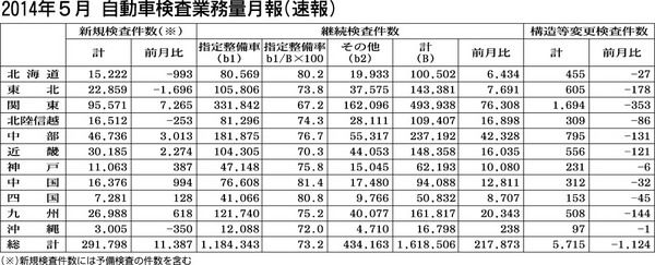 国土交通省は、5月の自動車検査業務量(速報)をまとめた。それによると、新規検査件数は前年同月比2万7070件減(8・5%減)の29万1798件、継続検査件数は同16万7327件減(9・4%減)の161万8506件。構造等変更検査件数は同2...