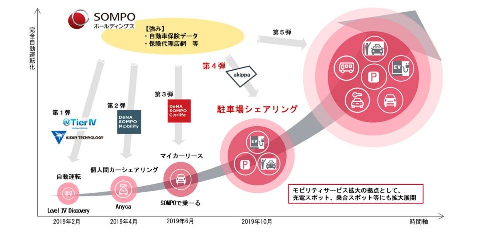 SOMPOは、MaaS(モビリティ・アズ・アサービス)関連事業を将来に向けた成長分野と位置付け、自動運転サービスのソリューション開発や、個人間カーシェアリング事業、マイカーリース事業に相次いで参入している。今回、新たにakippaに出資して駐車場シェアリング事業に参入、MaaS関連事業を拡大する取り組みを加速する。