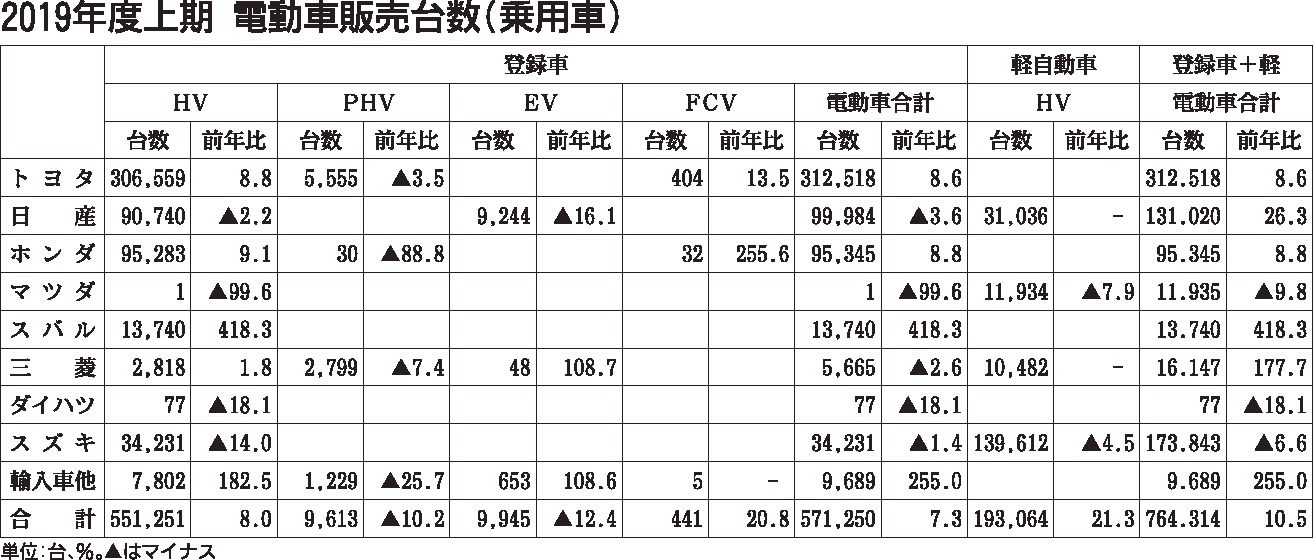 2019年度上期(4~9月)の乗用車販売(軽自動車含む)における電動車台数は、前年同期比10・5%増の76万4314台となった。15年(軽は16年)の統計開始以来、上期として過去最高を更新した。乗用車に占める電動車比率は35・3%となり、...