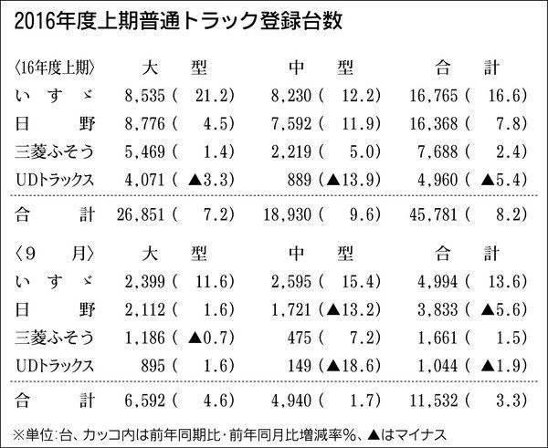 業界筋がまとめた2016年度上期(4~9月)の普通トラック(積載量4トン以上)販売は、前年同期比8・2%増の4万5781台となった。大型は同7・2%増の2万6851台、中型は同9・6%増の1万8930台でともにプラスだった。物流系のカーゴ...