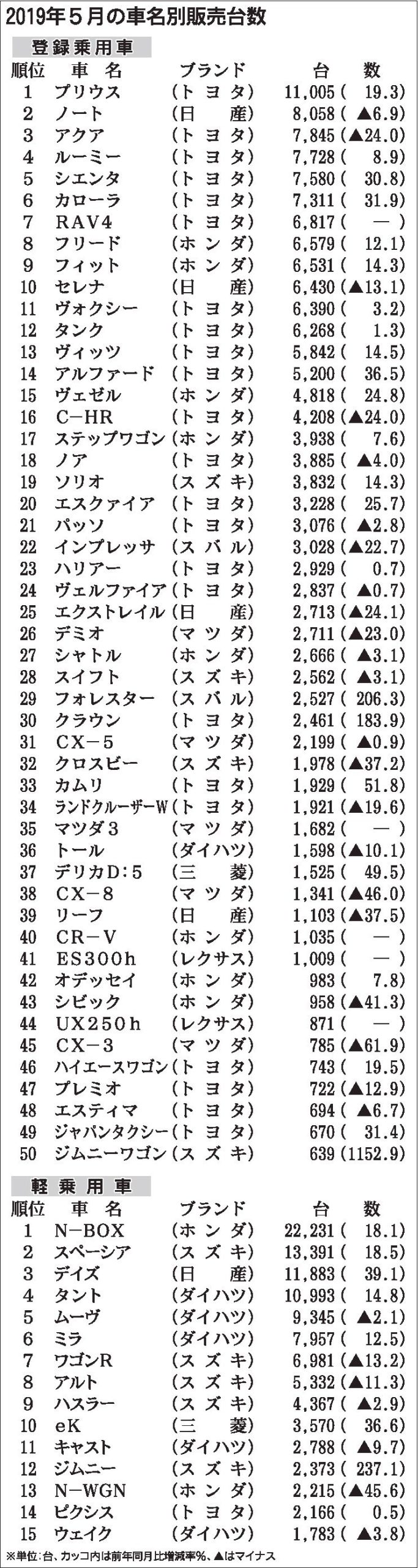 5月の車名別販売台数