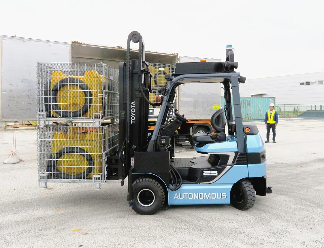 豊田自動織機は8日、自動運転フォークリフトを愛知県半田市にある同社施設で公開した。まず、労働力不足が深刻な農業での実用化を目指し、来年から実証実験に入る=写真。 同社は1970年代から自動運転フォークリフトの開発をはじめ、17年には構内作...