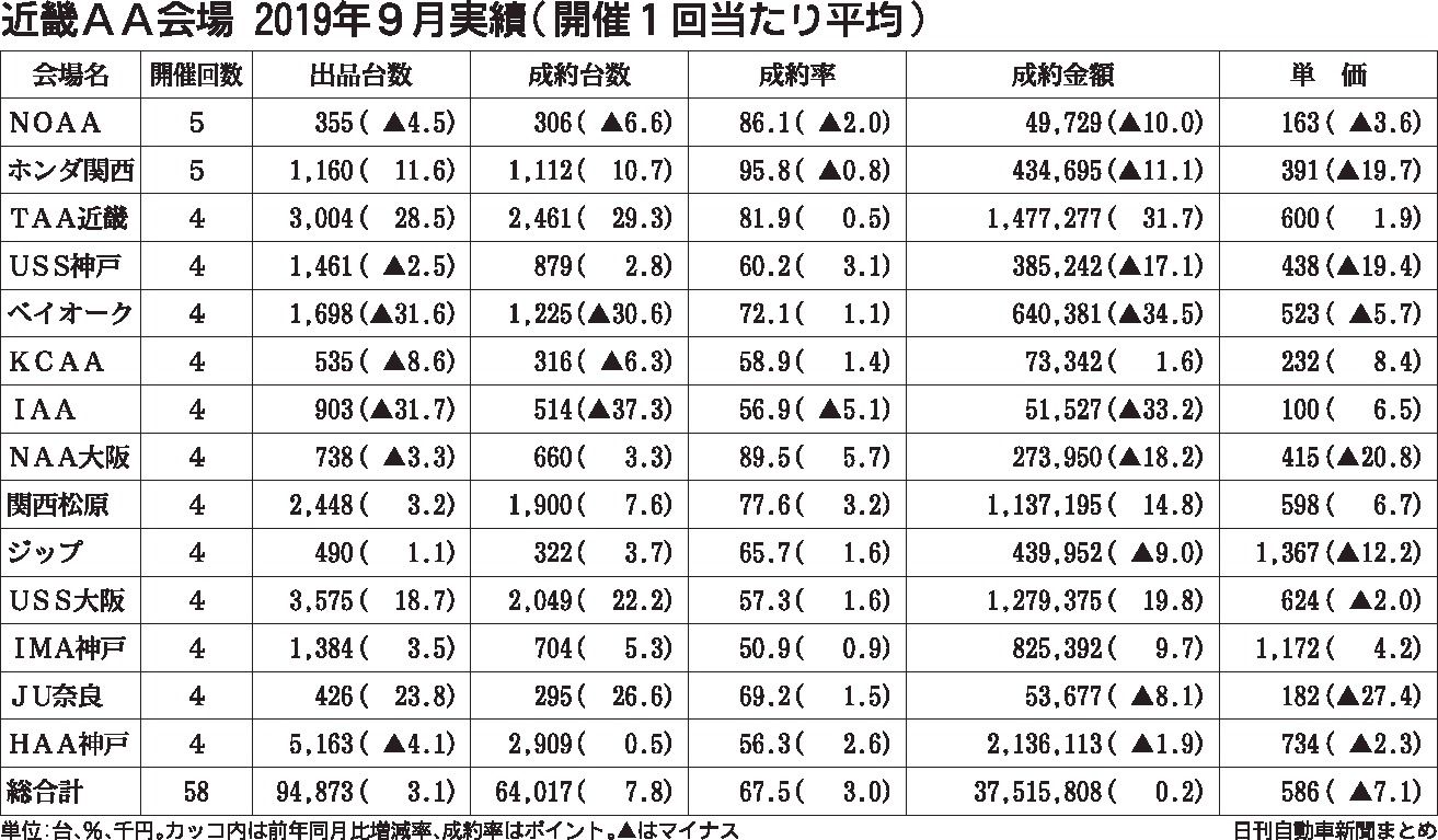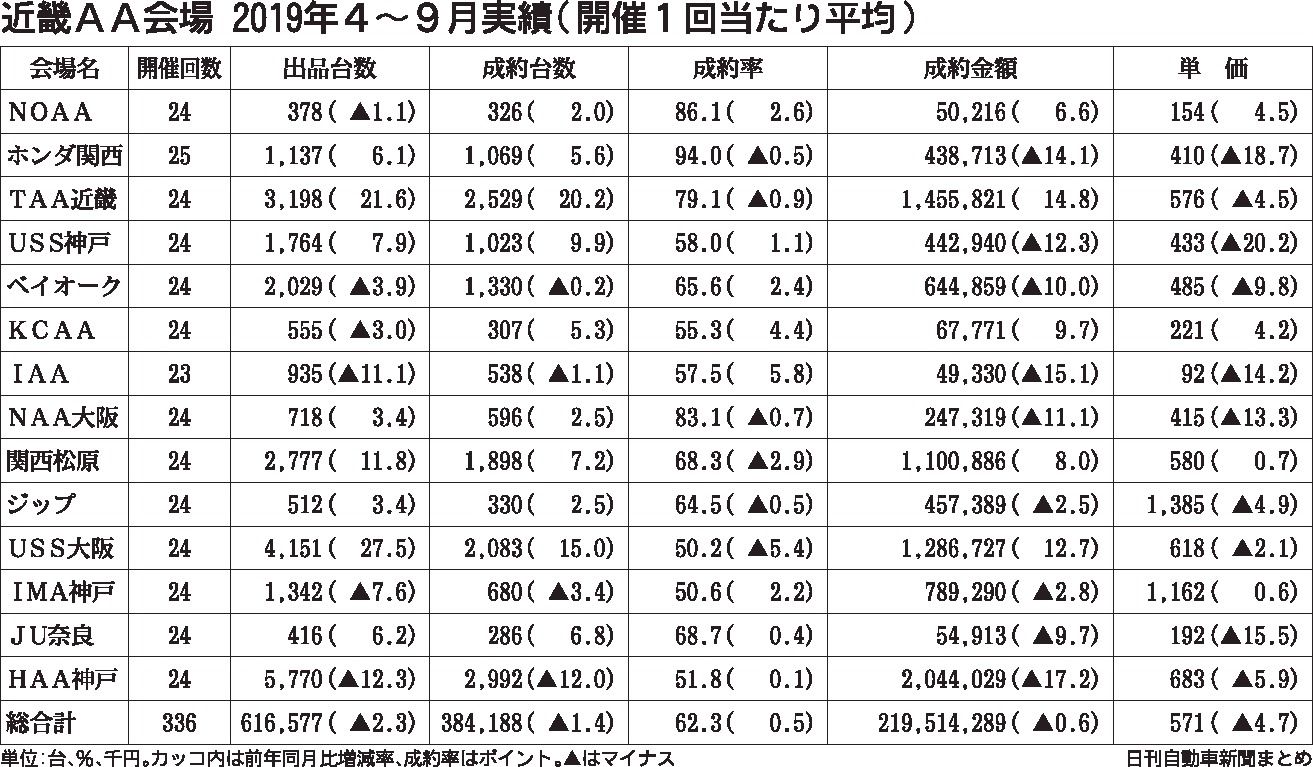 日刊自動車新聞は近畿地区の中古車オークション(AA)14会場の2019年度上期(4~9月)の実績をまとめた。開催回数は前年同期に比べ18回少ない336回。出品台数と成約台数、成約金額、単価はいずれもマイナスとなったが、成約率は0・5㌽増を...