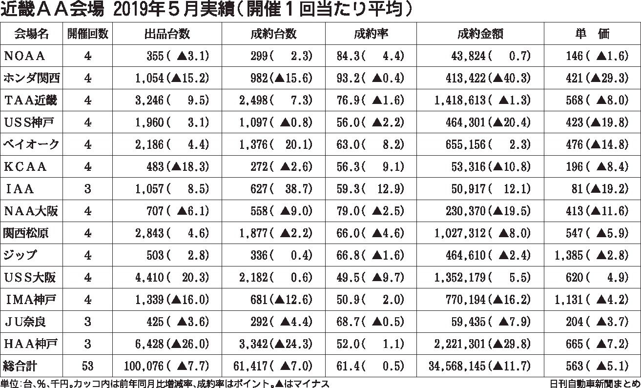 近畿地区にある中古車オークション(AA)14会場の5月実績がまとまった。開催数は全53回で、前年同月に比べ4回減だった。出品台数は前年同月比7・7%減の10万76台、成約台数も7・0%減の6万1417台とマイナスとなったが、成約率は0・5...