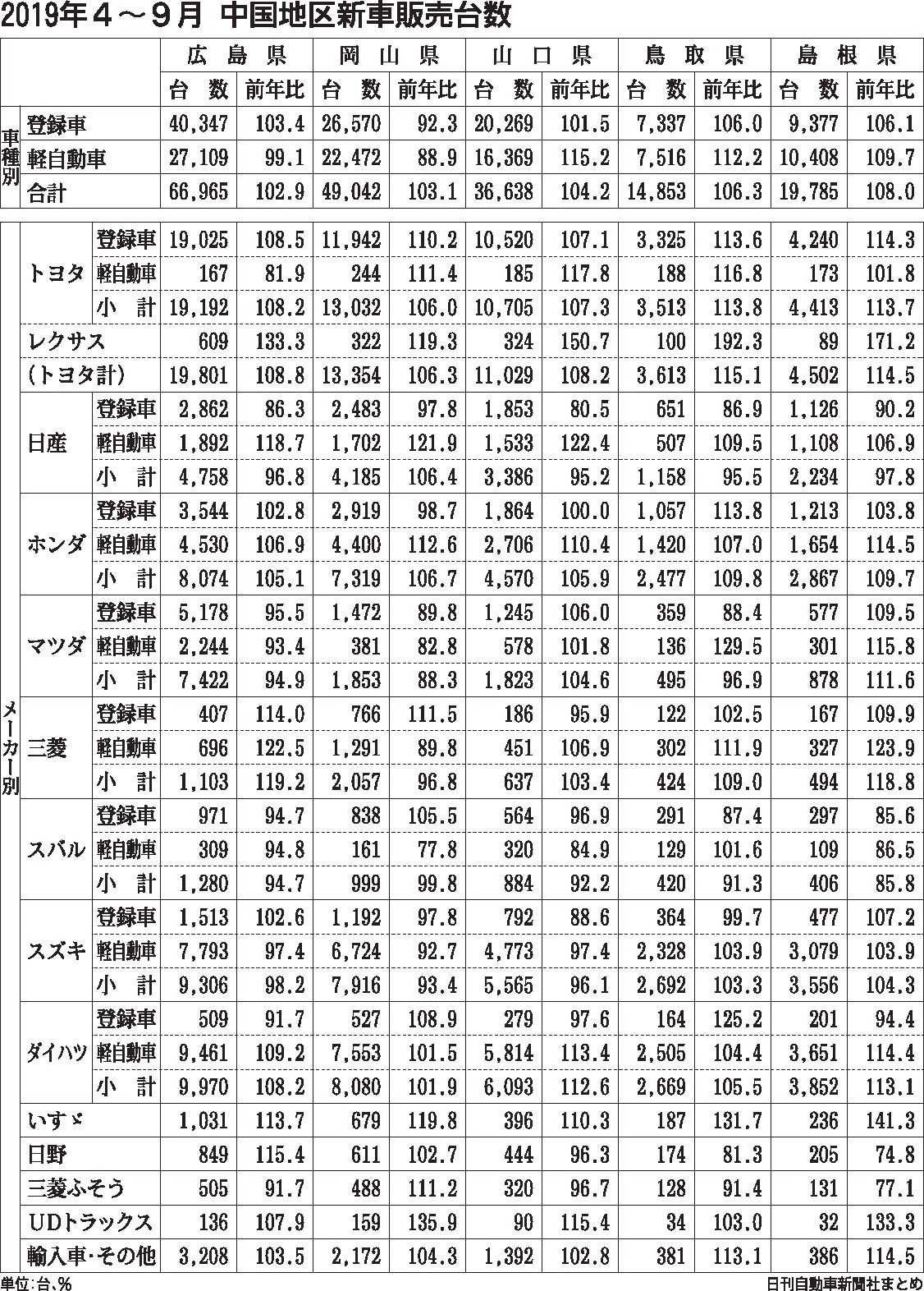 中国地区の2019年上半期(4~9)月の新車販売台数は前年同期比4・3%増の18万7774台となり、4年連続で増加した。登録車は4・0%増の10万3900台、軽自動車は4・5%増の8万3874台だった。軽の増加幅が大きかった影響で新車販売...