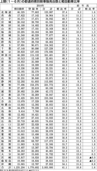 日刊自動車新聞は2014年上期(1~6月)の都道府県別新車販売実績をまとめた。登録車と軽自動車合計で前年同期実績と比べ最も伸び率が高かったのは滋賀で17・8%増。滋賀では軽自動車の販売が大きく伸びており、新車販売全体に占める軽自動車の割合...