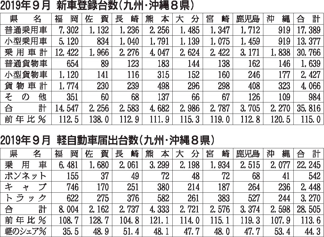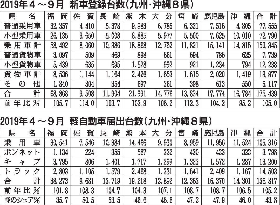 九州・沖縄地区の2019年度上期(4~9月)の新車販売台数は前年同期比5・1%増の31万2256台となり、3年連続で増加した。登録車、軽自動車ともに伸長した。沖縄のみ登録車が前年割れしたものの、軽の販売台数の増加がカバーし全県で新車総市場...