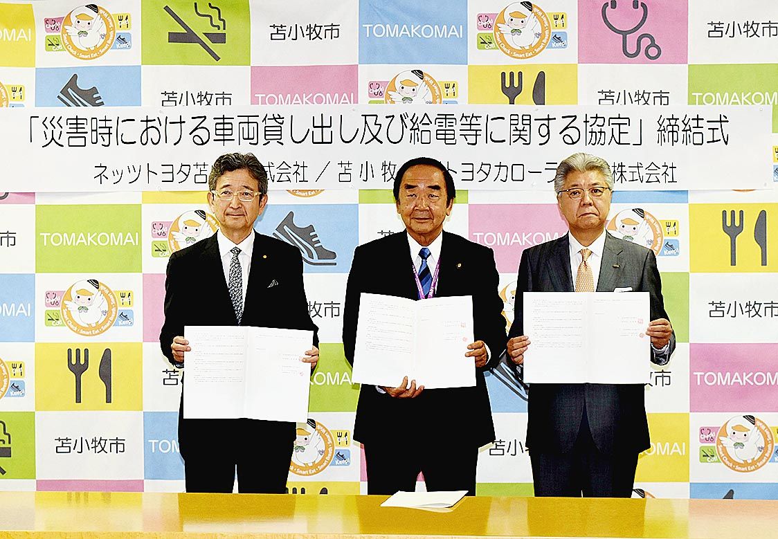 【苫小牧】苫小牧に本社のあるトヨタカローラ苫小牧(野中法之社長)とネッツトヨタ苫小牧(大島光太郎社長)は4日、苫小牧市と「災害時における車両貸し出し及び給電等に関する協定」を締結した。昨年9月6日に発生した北海道胆振東部地震を契機とした取...