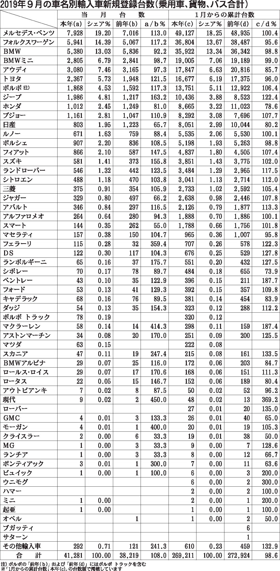 2019年9月の車名別輸入車新規登録台数(乗用車、貨物、バス合計)