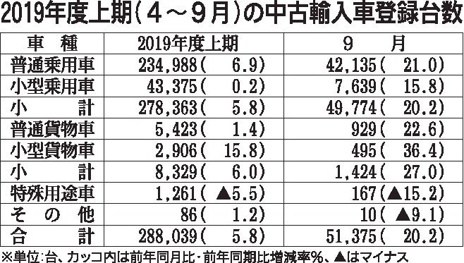 日本自動車輸入組合が10日発表した2019年度上期の中古輸入車登録台数は、前年同期比5・8%増の28万8039台となり、5年連続で前年を上回った。9月単月は同20・2%増の5万1375台。 上期実績は、乗用車、貨物車ともに前年実績を上回っ...