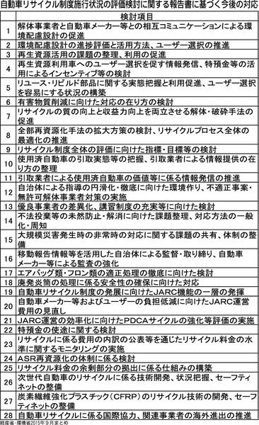 経済産業省と環境省は9月30日、自動車リサイクルの合同会議を開催した。今回の会議では両省が昨年9月に取りまとめた報告書で検討事項とした28項目(図)の取り組み状況などを承認。このうちユーザーインセンティブ制度の導入など重要論点については今...