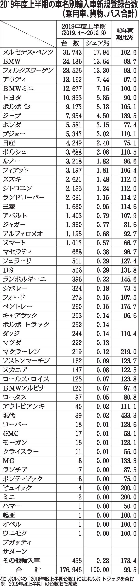 2019年度上半期の車名別輸入車新規登録台数(乗用車、貨物、バス合計)