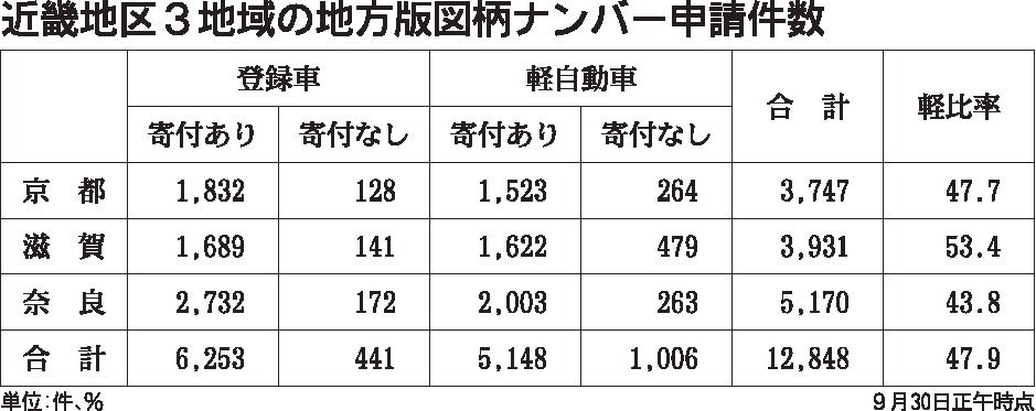 近畿地区の「地方版図柄入りナンバープレート」の申請件数が交付開始から1年で1万の大台を超えた。交付開始の2018年10月1日から19年9月30日正午時点までの近畿3地域(京都、滋賀、奈良)の合計申請件数は1万2848件に達した。いずれの地...