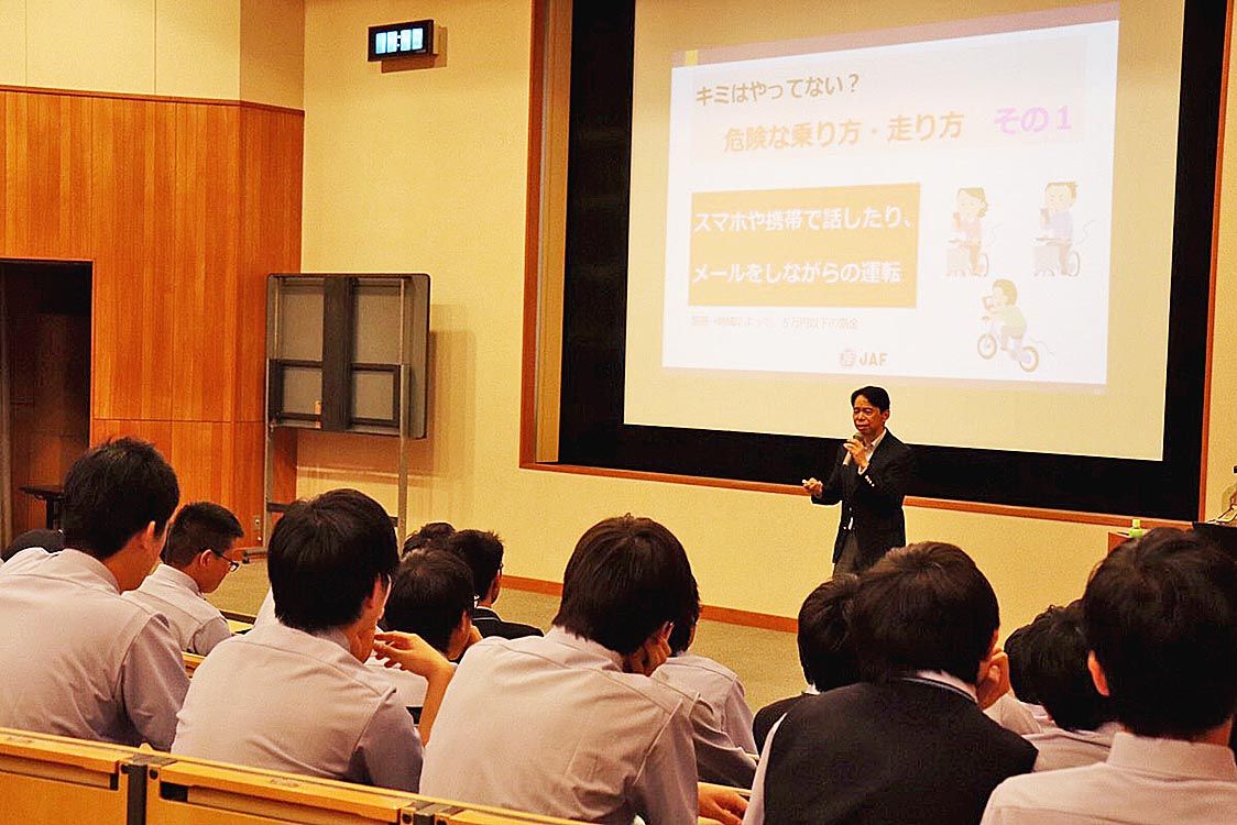 日本自動車連盟(JAF)大阪支部(白土貴久支部長)は東大阪大学柏原高等学校(柏原市)で交通安全講習会を実施した=写真。春の全国交通安全運動期間に合わせ、新入生と先生の約250人を対象に自転車利用に関して講義した。 JAFの講師が「高校生の...