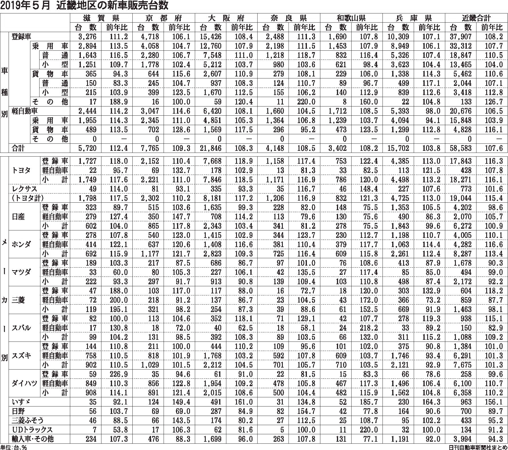近畿2府4県の5月の新車販売台数は登録車と軽自動車の合計が前年同月比7・6%増の5万8583台となり、2カ月連続で前年を上回った。伸び幅は4月に続き今年最高を更新している。登録車は8・2%増の3万7907台、軽も6・5%増の2万676台で...