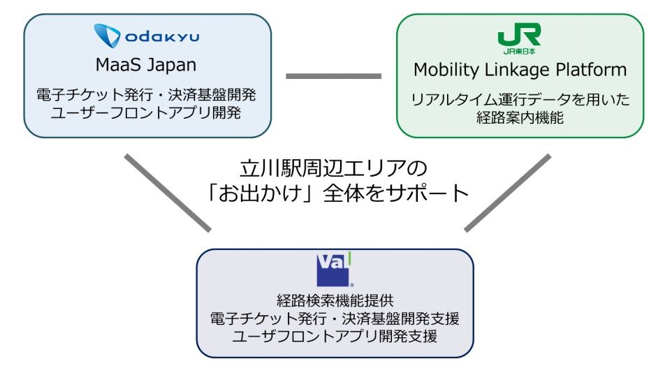 小田急とJR東日本は、ヴァル研究所(東京都杉並区、菊池宗史代表取締役)の協力も得て、MaaSを展開する。第1弾としてJR東日本・中央線の東京~甲府間と南武線、小田急グループの立川バスのリアルタイム運行データを使った経路案内と、多摩モノレールの1日乗車券、多摩動物公園などの沿線施設の利用券をセットにした電子チケットを1つのアプリで提供する実証実験を実施する。鉄道とバスのリアルタイム運行データの両方を使った経路案内の提供は、日本で初となる予定。