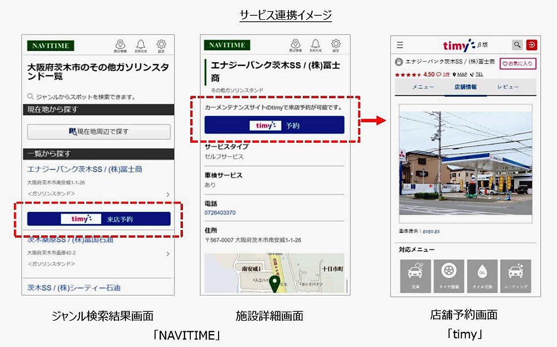 カーフロンティア(小出徹社長、東京都千代田区)が運営する整備予約サイト「timy(タイミー)」が、ナビタイムジャパン(大西啓介社長、東京都港区)のナビゲーションサービス「NAVITIME」と連携を開始した=写真。タイミーに登録した整備工場...