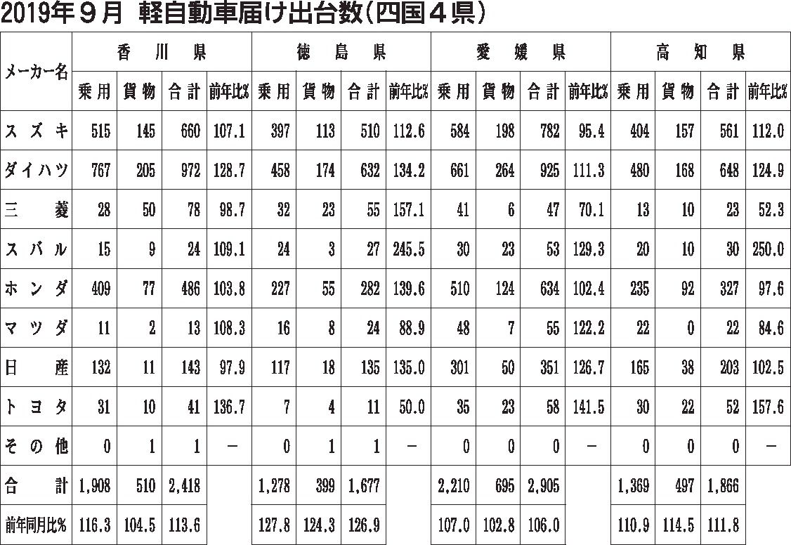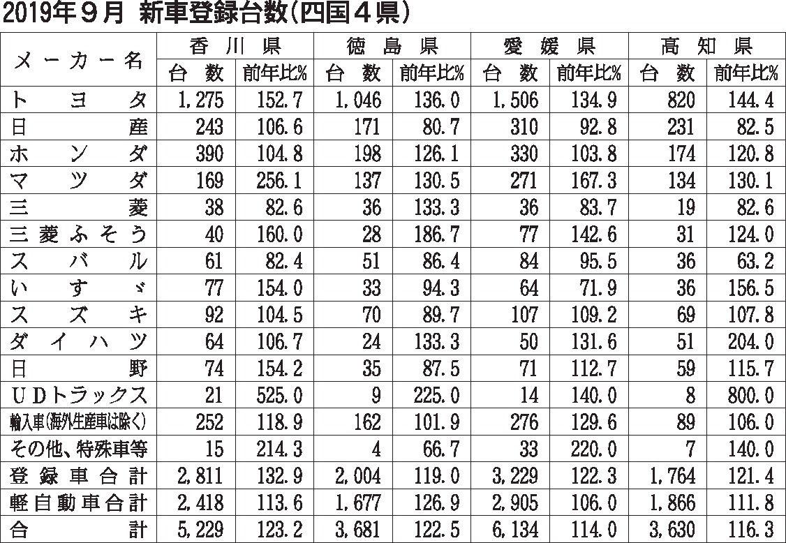 2019年度上期(4~9月)の四国地区の新車販売台数(含軽)は、前年同期比9・1%増の8万6475台となり、3年連続で増加した。新型車効果と消費増税前の一部の駆け込み需要が追い風となり、登録車は同9・2%増の4万4727台で2年ぶりに増加...