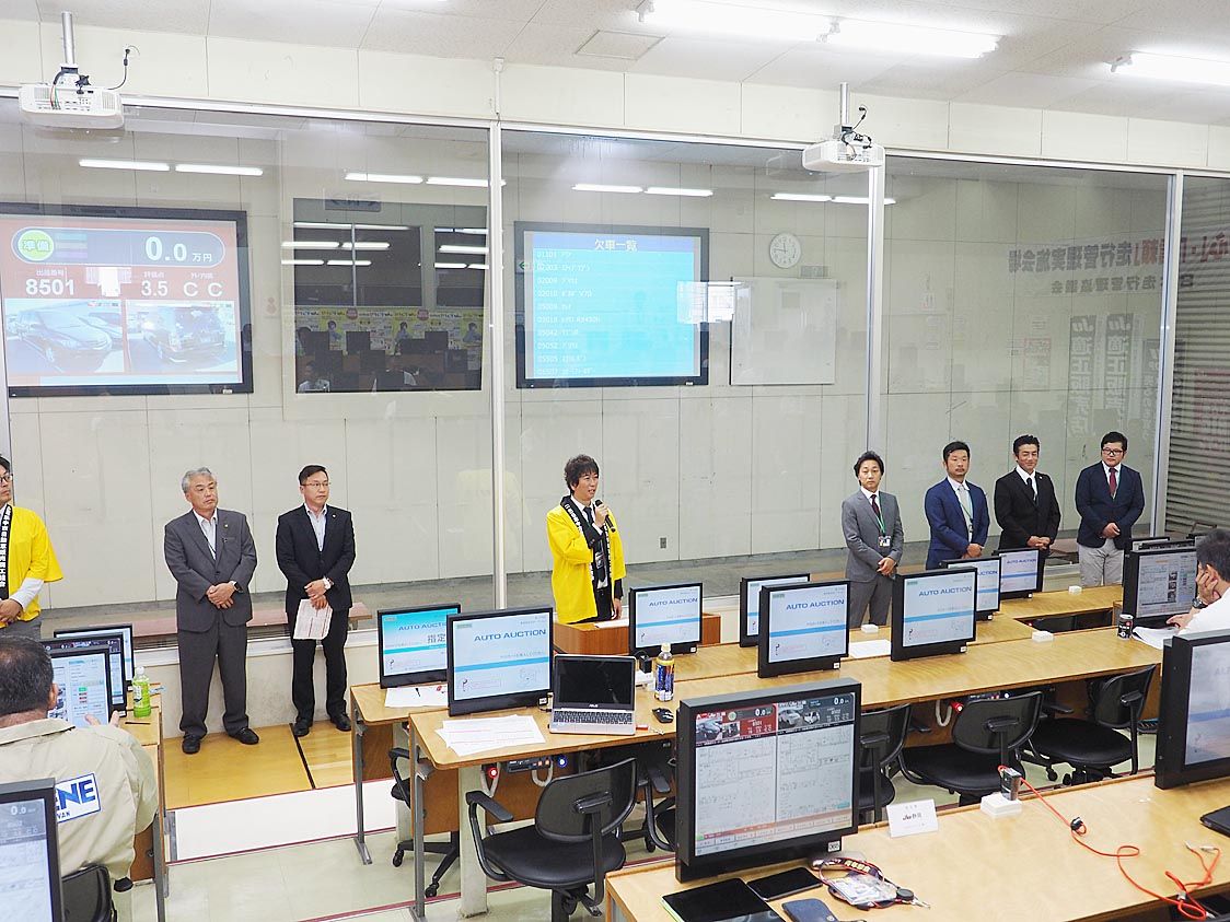 【津】三重県中古自動車販売商工組合(JU三重、奥村悦二理事長)は11日、津市のオートオークション(AA)会場で「青年部担当AA」を開催した=写真。出品台数は852台と出品車を置くヤードがほぼ満車となった。泰道雅也青年部会長はオープニングセ...