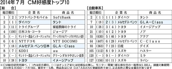 CM総合研究所(関根建男代表)がまとめた2014年7月度のCM好感度ランキング。総合トップはソフトバンクモバイルの「ソフトバンク」が2カ月ぶりにトップに返り咲いた。2位は先月、自動車関連として16年ぶりの首位に立ったダイハツ「タント」。3...
