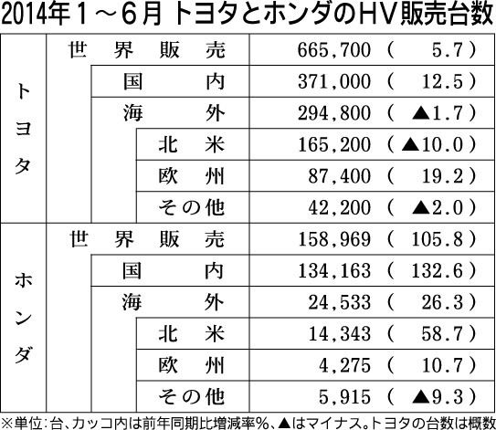 トヨタ自動車とホンダの2014年上期(1~6月)のハイブリッド車(HV)世界販売台数がまとまった。日刊自動車新聞社の調べによると、トヨタ自動車は前年同期比5・7%増の66万5700台となり、ホンダは同2倍以上の15万9千台と飛躍的に拡大し...