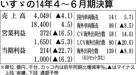 いすゞ自動車が4日発表した2014年4~6月期連結業績は、営業利益が前年同期比16・5%減の372億円となり3年ぶりの営業減益となった。政情不安が発生したタイなど主力のアジアで販売が落ち込んだほか、将来成長につながる投資拡大が足元の業績に...