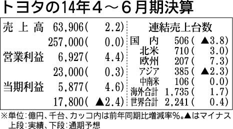 トヨタ自動車が5日発表した2014年4~6月期連結決算(米国会計基準)は、営業利益が前年同期比4・4%増の6927億円となった。第1四半期として3年連続の増益。リーマンショック直前の07年4~6月期(6754億円)を上回り、過去最高を記録...