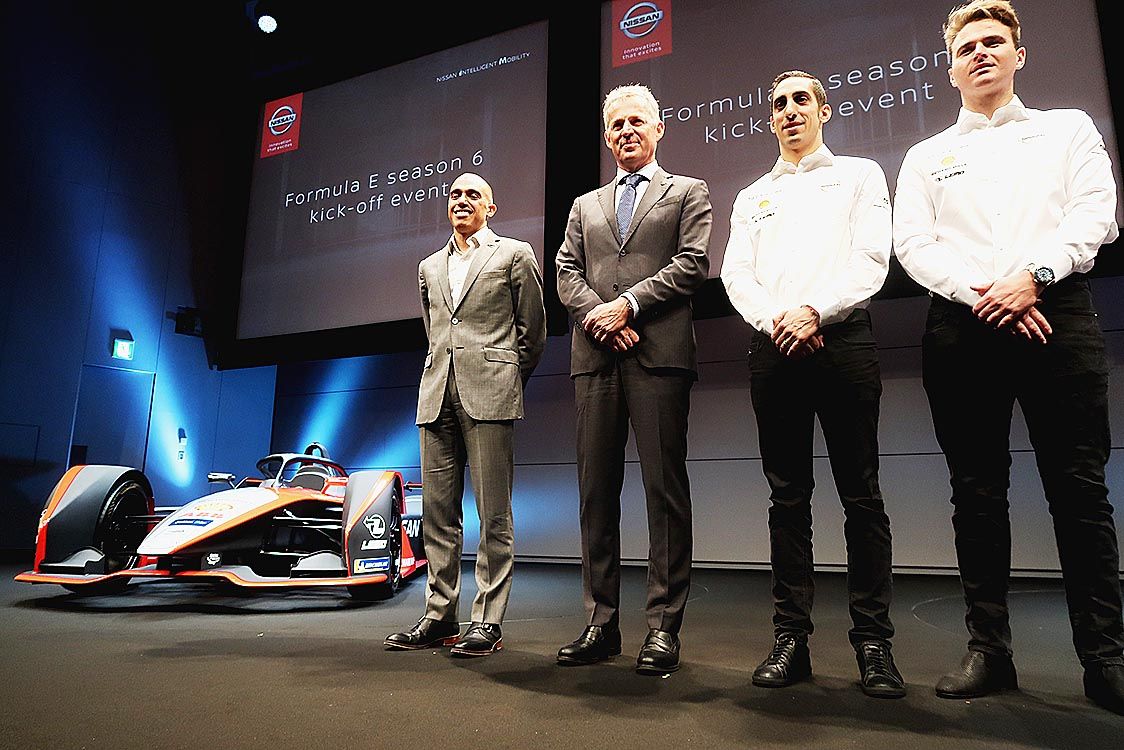 日産自動車は22日、11月中旬に開幕する「フォーミュラE選手権シーズン6」に参戦するマシンを公開した=写真。赤、黒、白の3色を着物のように重ね合わせたカラーパターンを採用したほか、レギュレーションの変更に合わせて従来のツインモーターをシン...