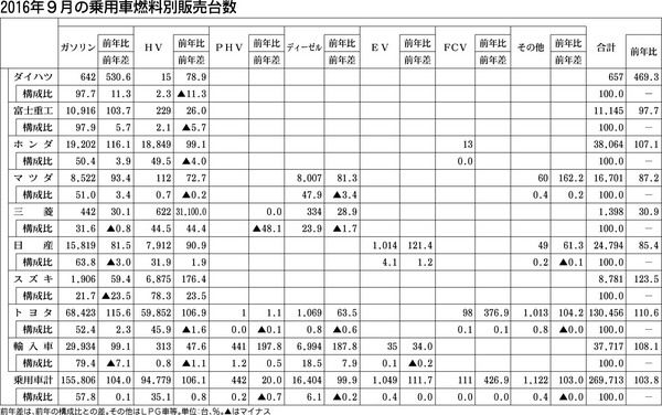 日本自動車販売協会連合会(自販連)がまとめた9月の乗用車燃料別販売台数は、ハイブリッド車(HV)が前年同月比6・1%増の9万4779台で10カ月連続で前年を上回った。トヨタ自動車「プリウス」や各モデルでHV設定車の販売好調が要因。日産自動...