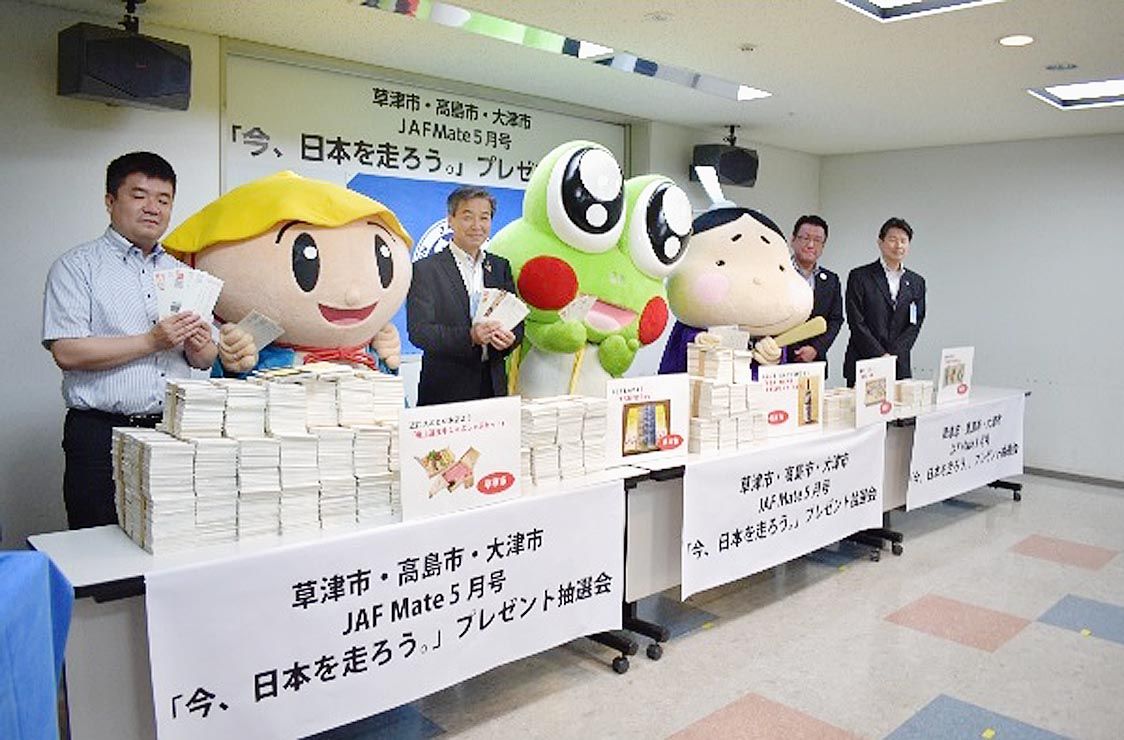 【大津】日本自動車連盟(JAF)滋賀支部(酒井雄一郎支部長)は13日、大津市ふれあいプラザで草津市や高島市、大津市と合同で「『今、日本を走ろう』プレゼント抽選会」を開いた=写真。会員情報誌「JAFメイト」5月号に掲載された3市特集企画のプ...
