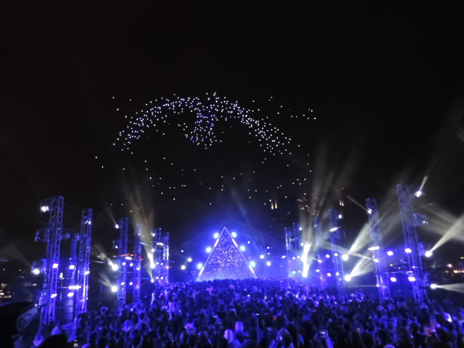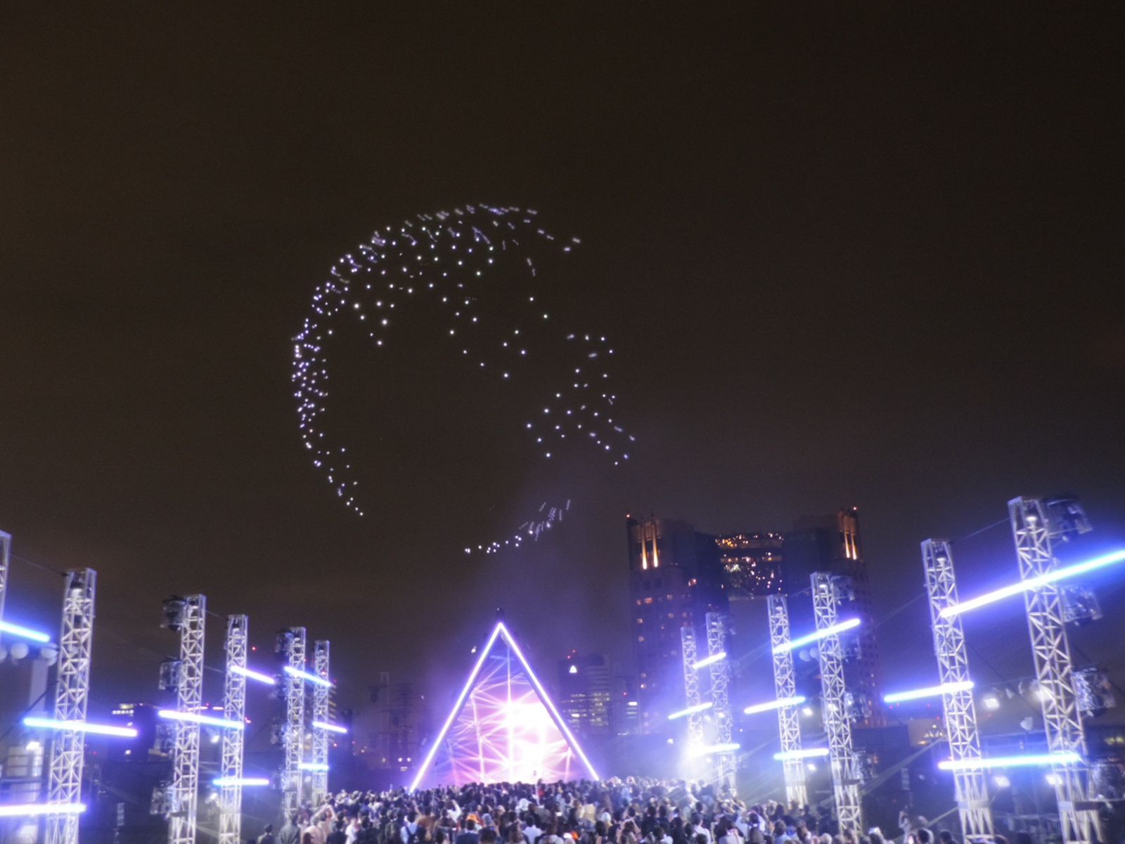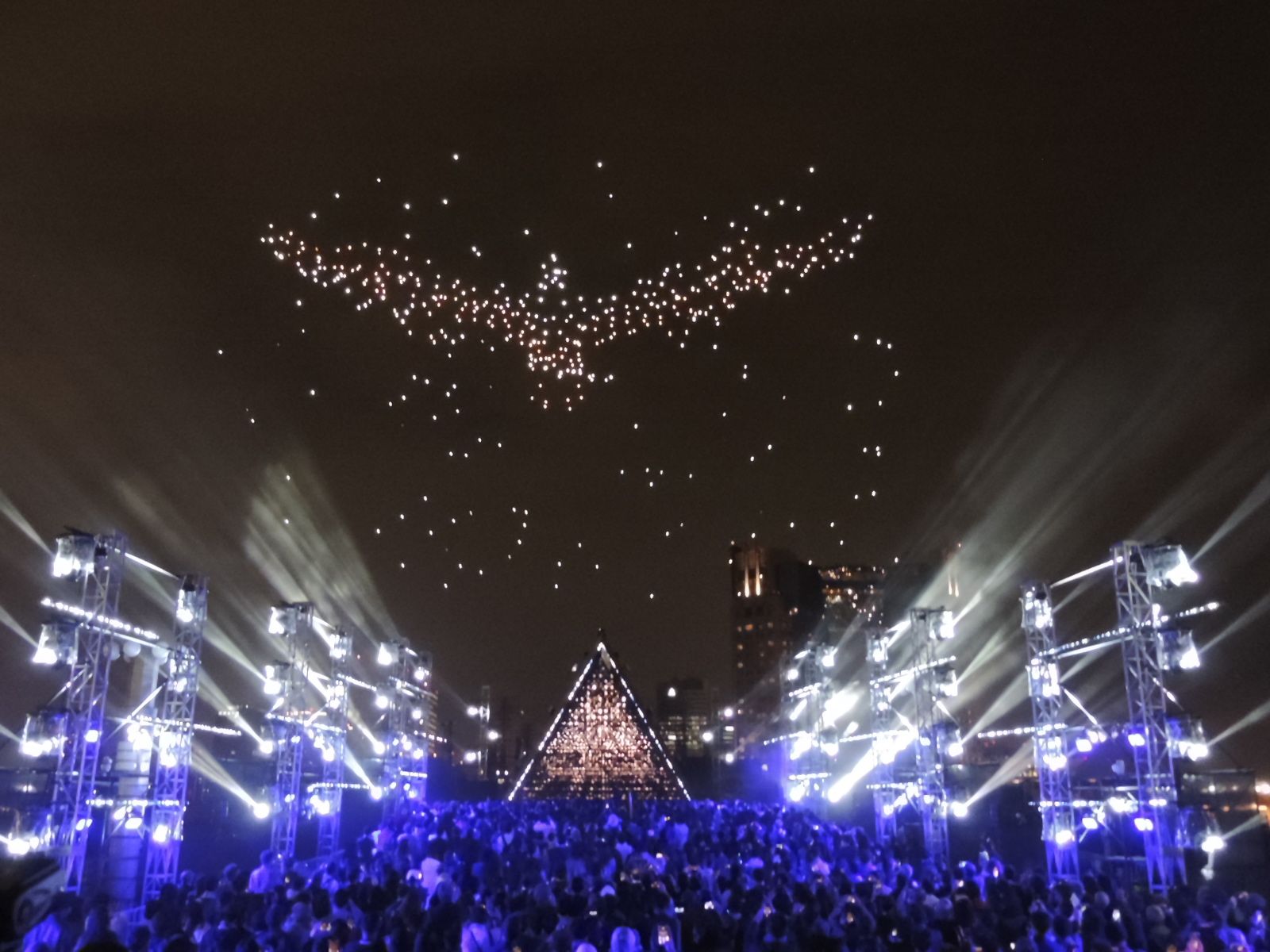 ドローンライトショーは、2000機以上のドローンを一斉にフォーメーション飛行させた実績のあるインテルが手がけた。