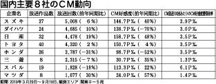 2019年度前半戦となる上期(4~9月度累計)の国内主要8社のCM動向は、出稿量(東京キー5局)は前年同期比でほぼ横ばいだった一方、CM好感度は同74%と減少した。吉岡里帆が〝おとなまる子〟を演じたダイハツ『ミラ トコット』の前年度のヒッ...