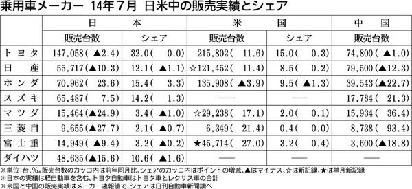 日本の乗用各社、7月の日米中における販売